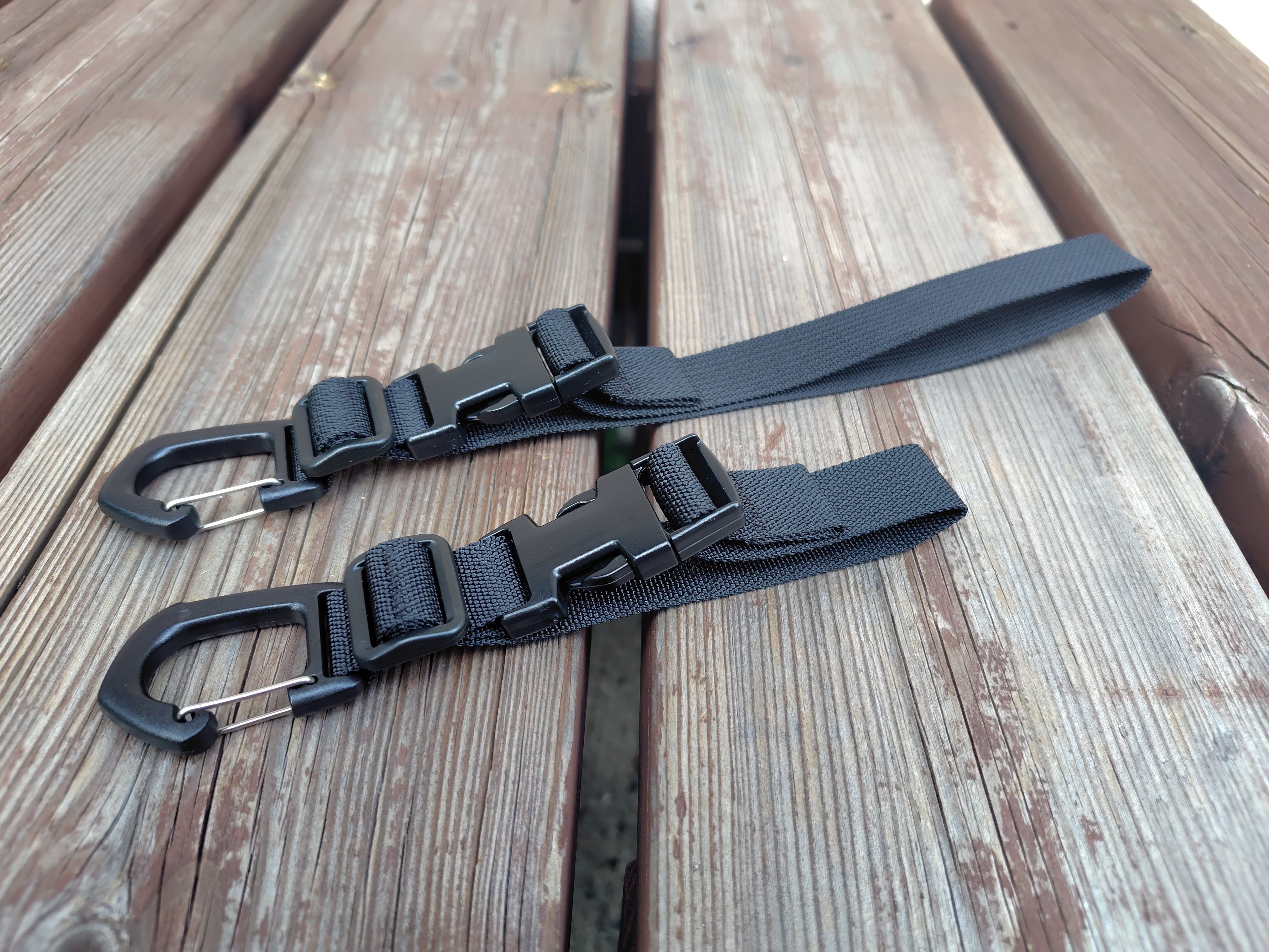 地面が濡れていてザックを直接置きたくない場合、車の座席にザックを乗せた時に倒れないように、長物をまとめたい場合や、ハイドレーションパックを木に吊るして軽い洗い物がしたいなどシチュエーションに合わせて使い方次第でちょっと便利なハングストラップ 20/40。