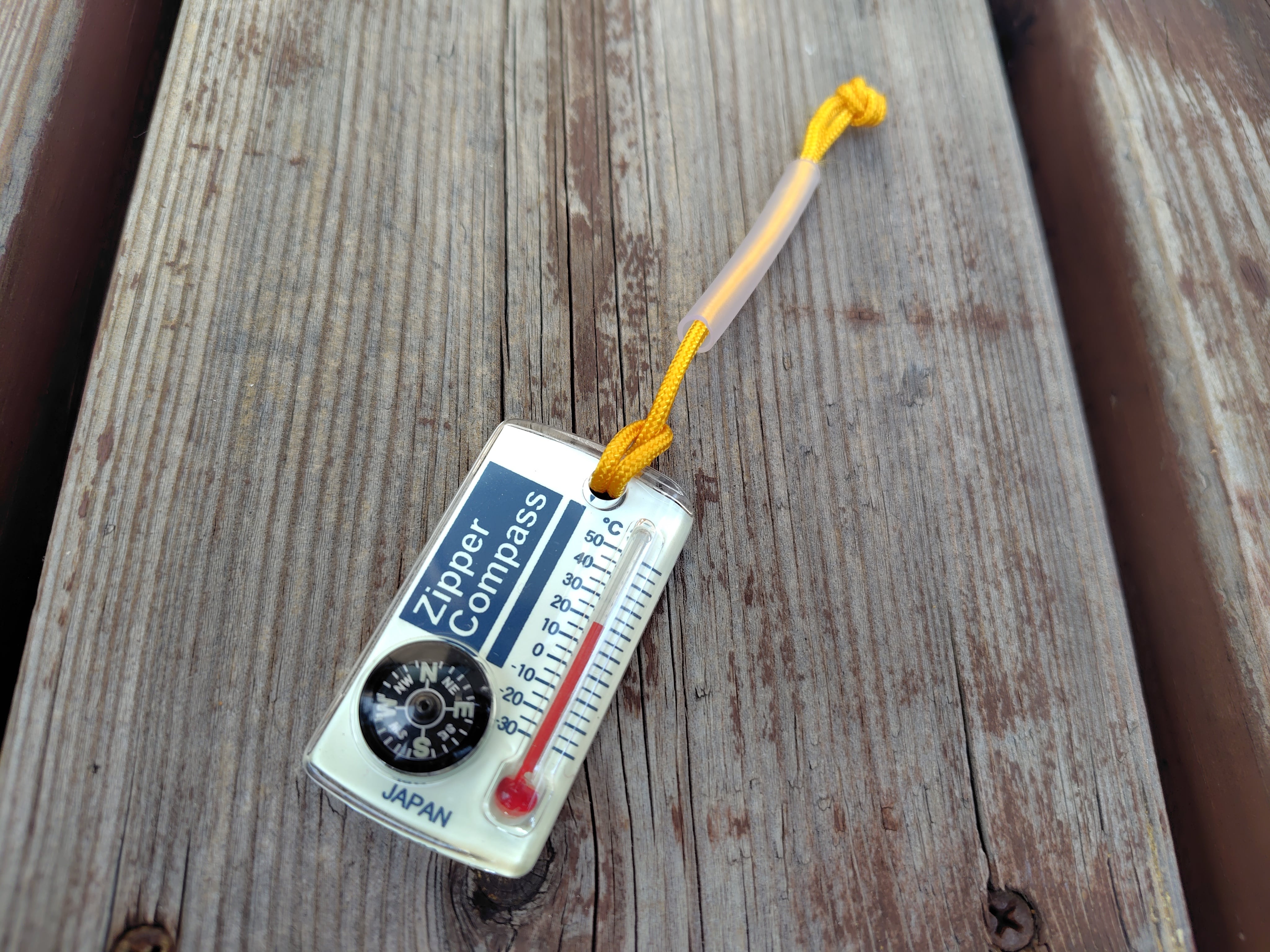 自分の位置を簡単に把握するためのコンパスと、山行中のウェアの着方などの目安になる温度計がセットになっています。