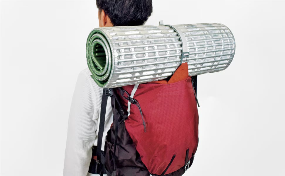 荷物の量に合わせて容量が調節できるロールトップ型バックパック。