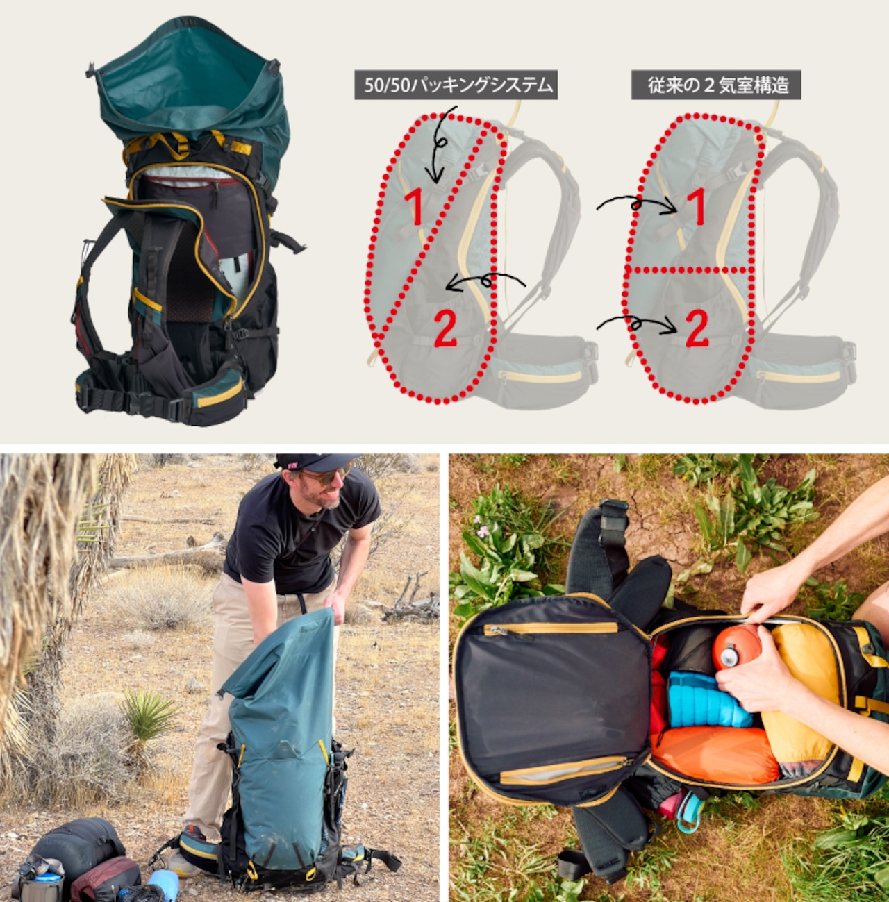 PINGORA独自の50/50パッキングシステム搭載で、荷物の量が増えても効率的な収納を叶えます。