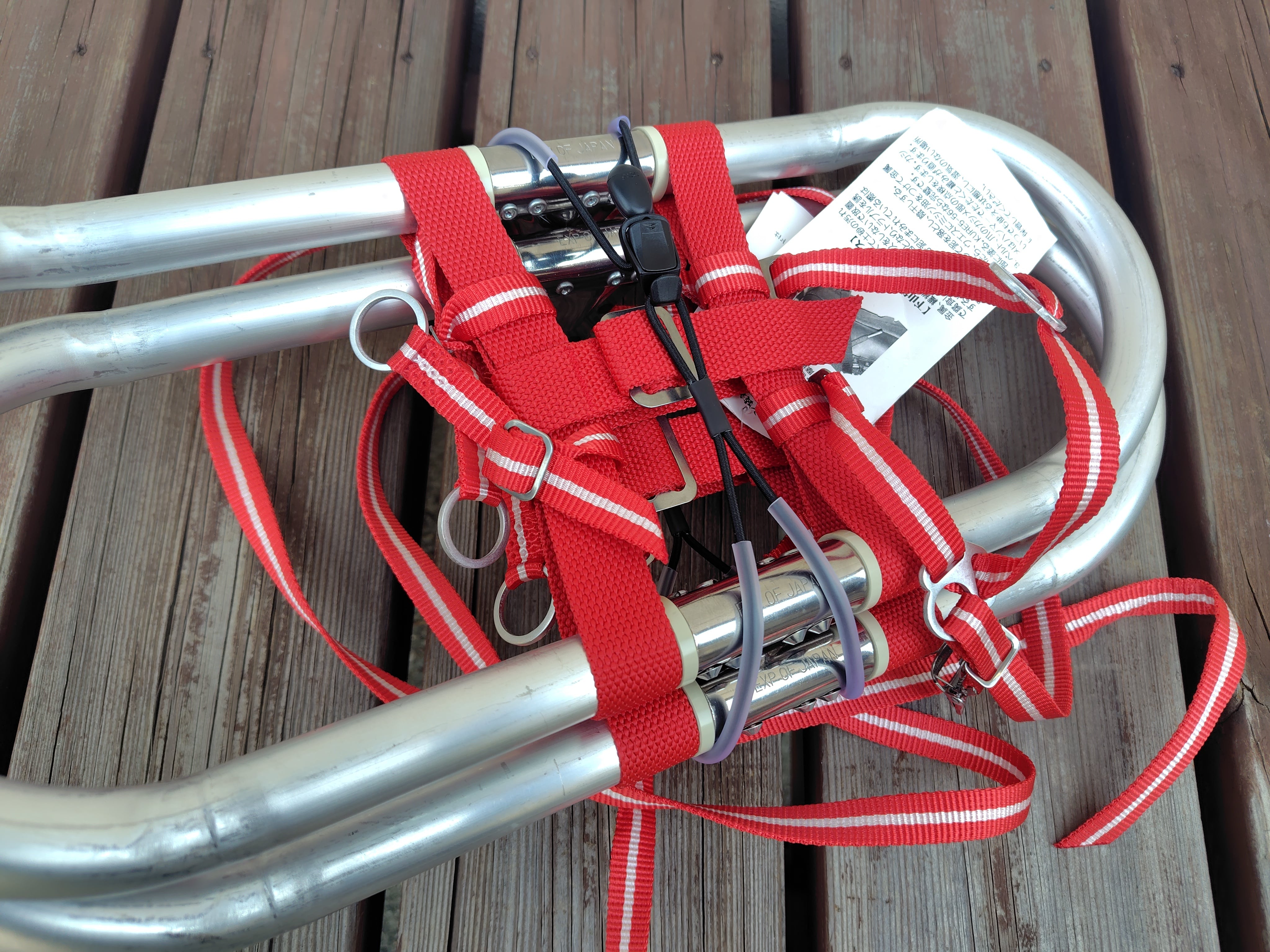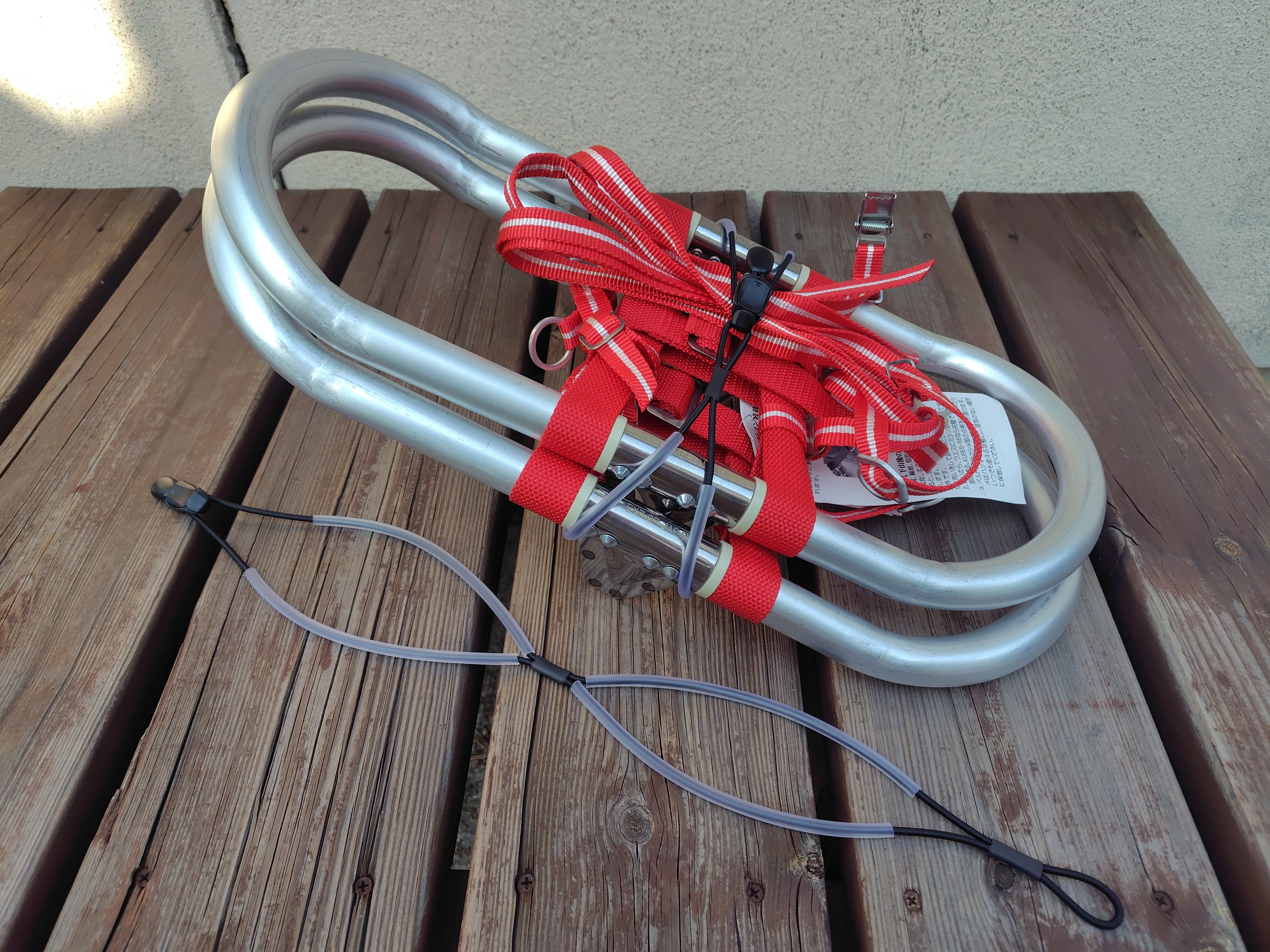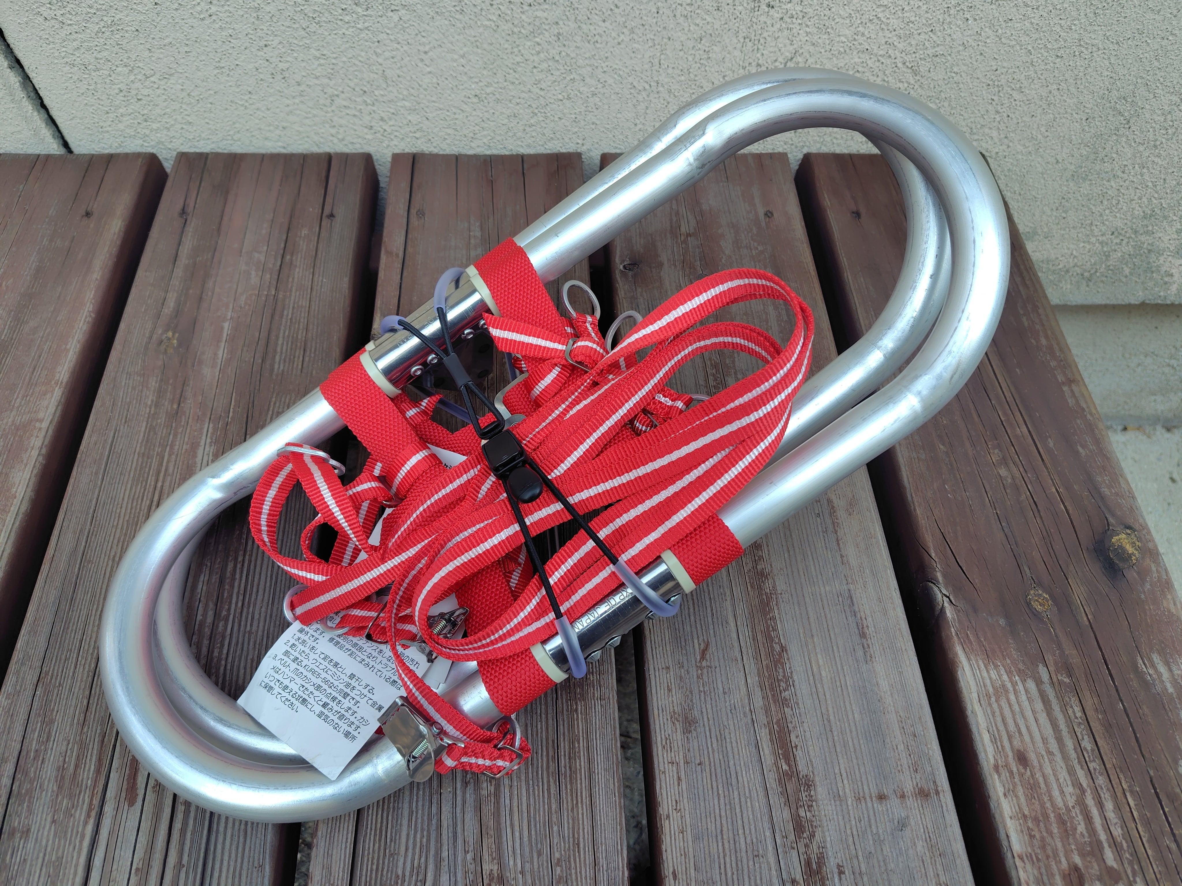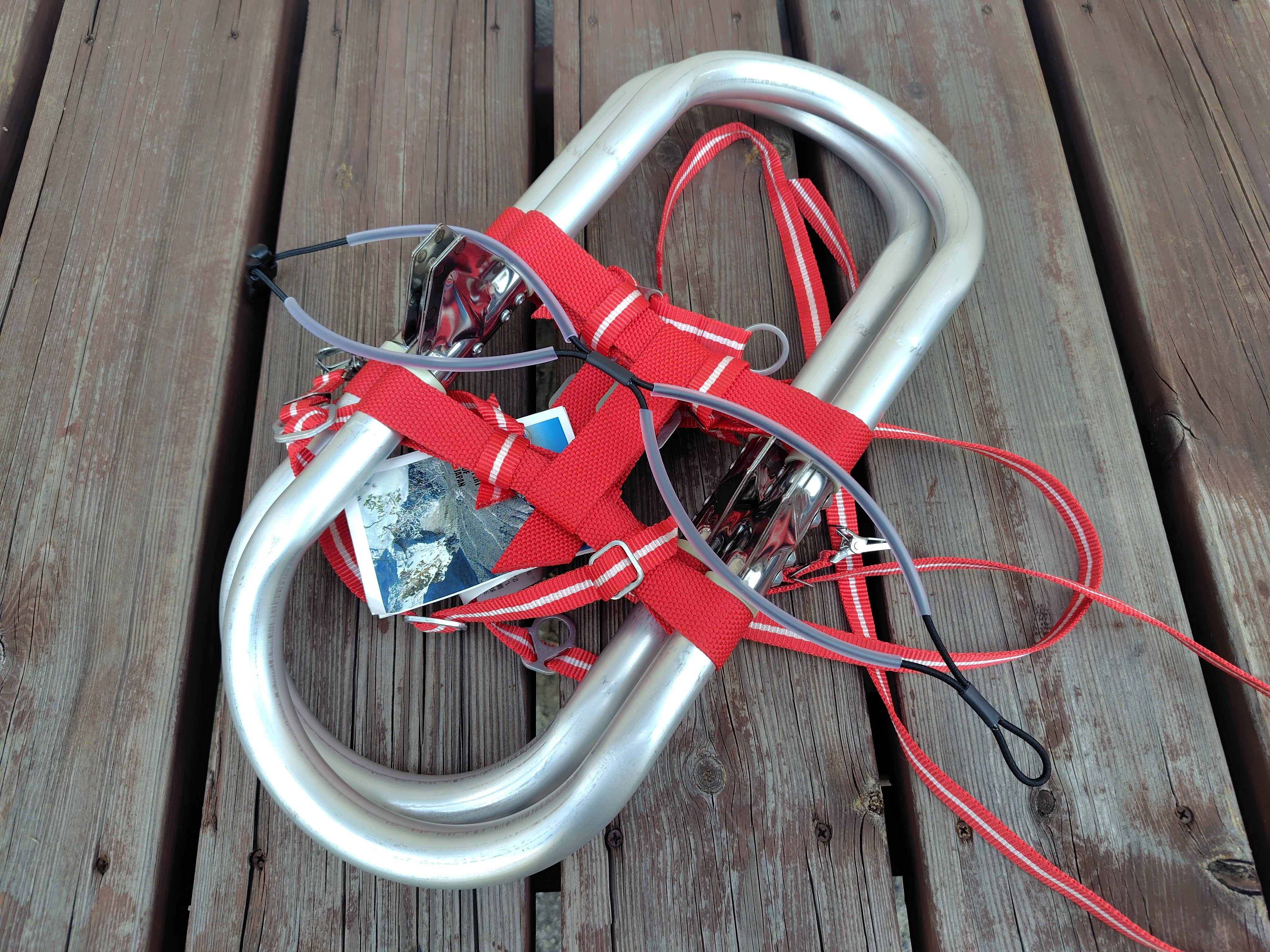 ワカンを二つ重ねた状態でシリコンチューブを爪側に巻いてフックで固定します。