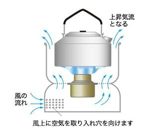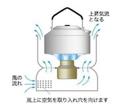 B25アルコールバーナーを使い、その火力を最大に引き出すために設計されているのがストームクッカーです。ストームクッカーはアルコールバーナーを固定するベースとその熱を逃がさないようにした風防+ゴトクで構成されます。ベース部分の側面にある小さな穴から空気を取り込みます。スタンドのベースに開けられた空気孔から引き込まれた空気が熱により上昇し、大量の酸素が供給されて高火力で安定します。
