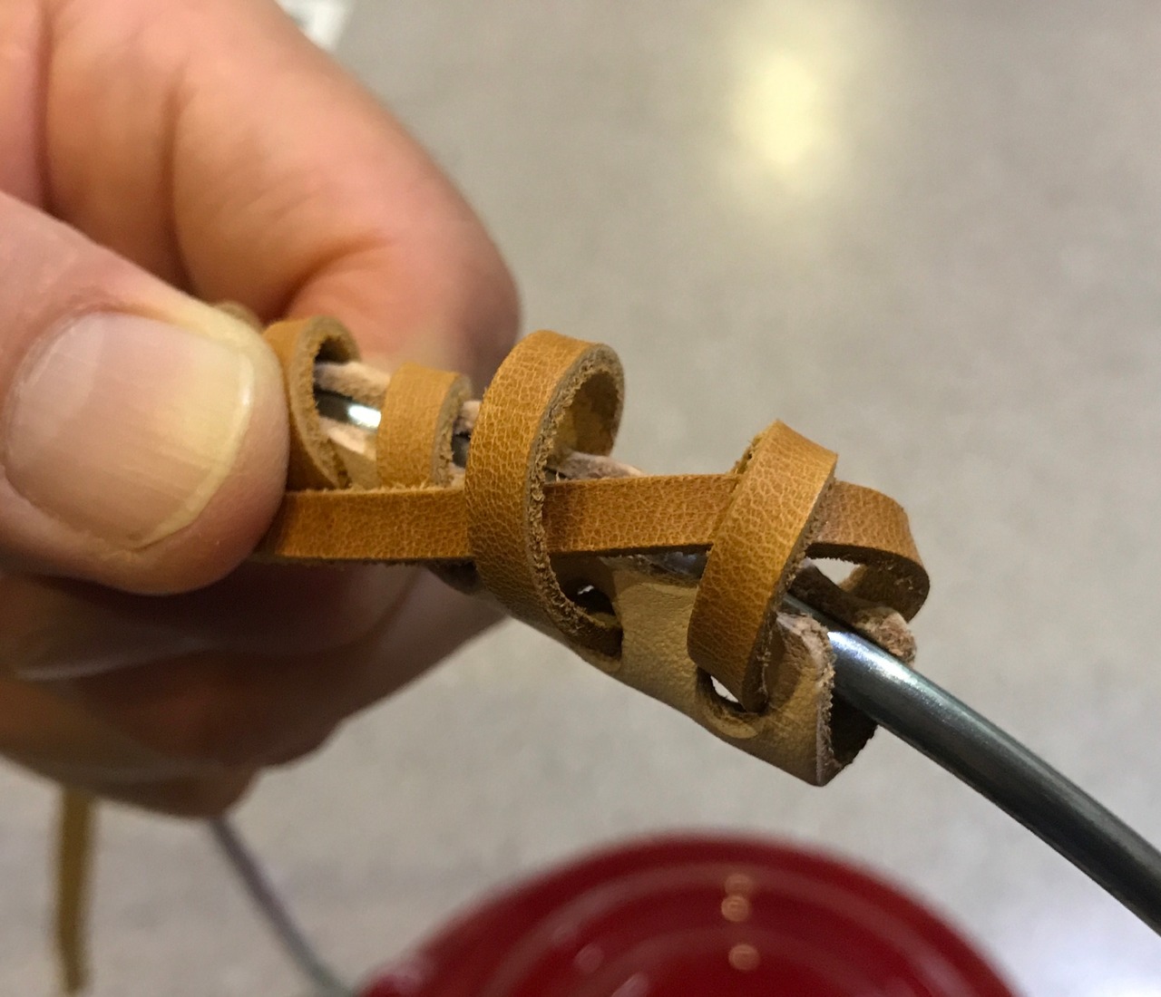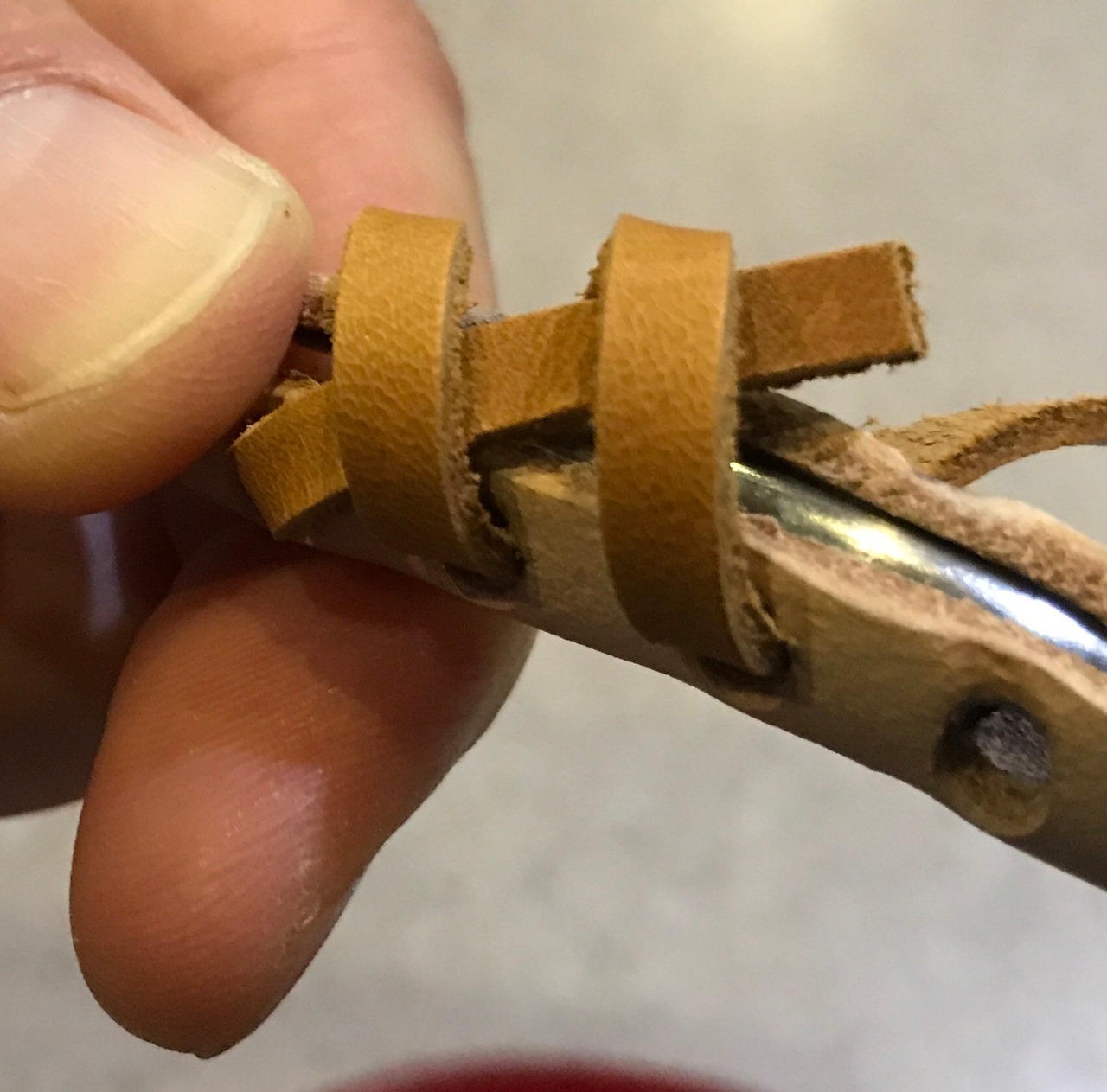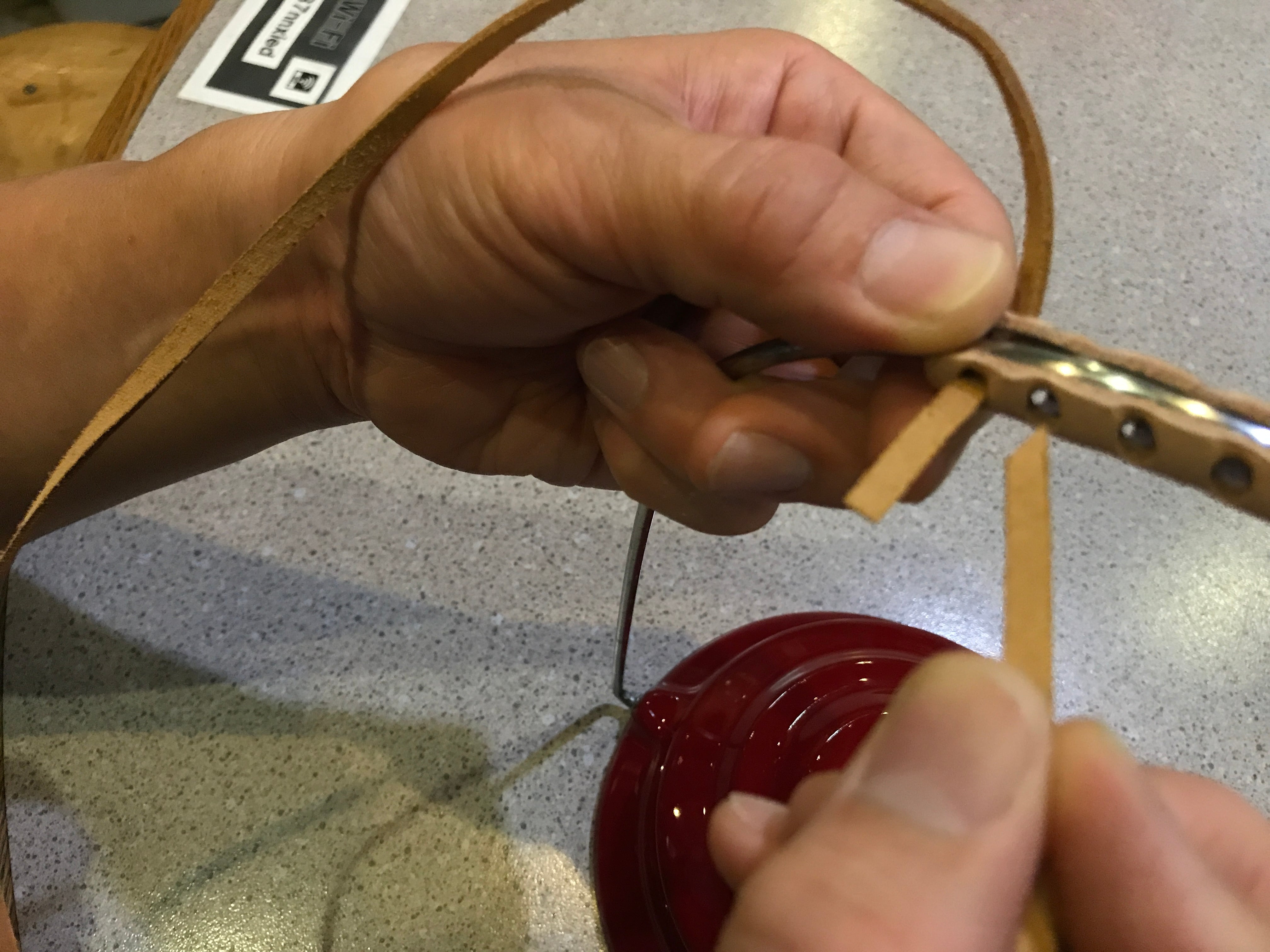 ①カバー右端の穴に革紐(尖った方)を通します。革紐には裏表がありますので表面が外を向くように注意をして、末端を約2cm残します。