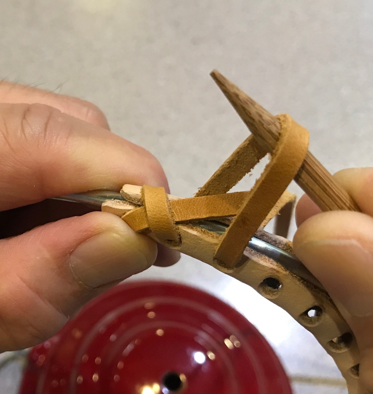 ②ハンドルの左右を逆にして2番目の穴に通して輪を作り末端を一番目、二番目の輪に通し、編み棒で締めていきます。