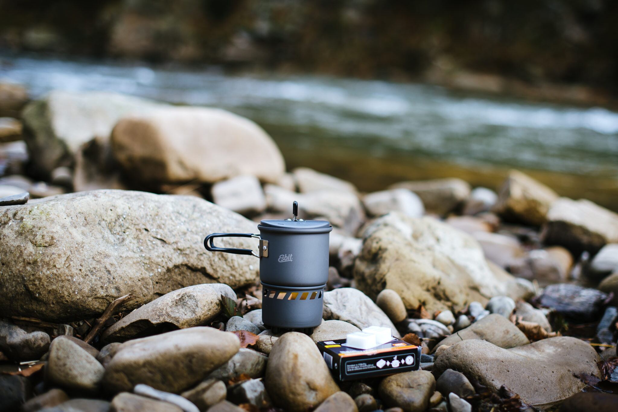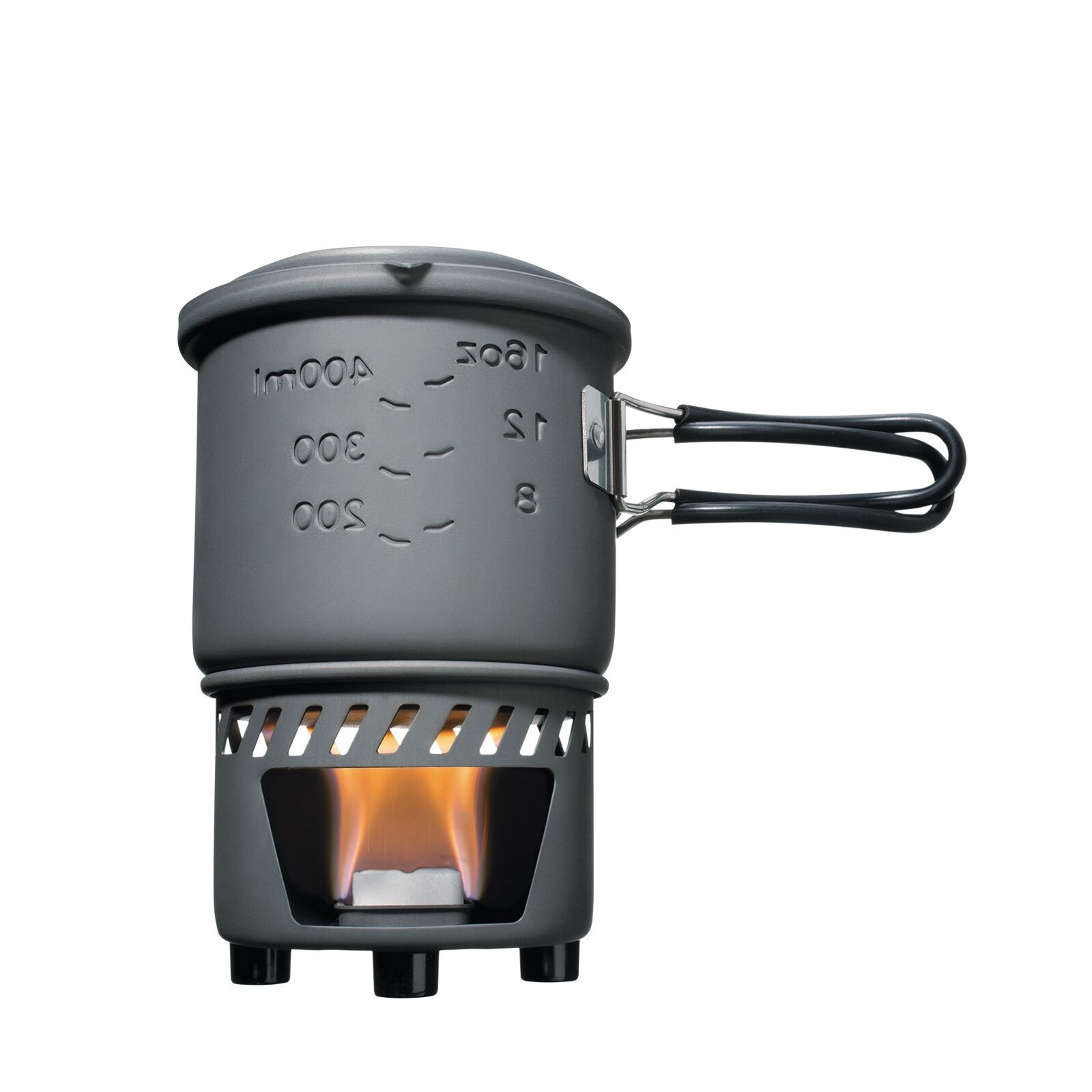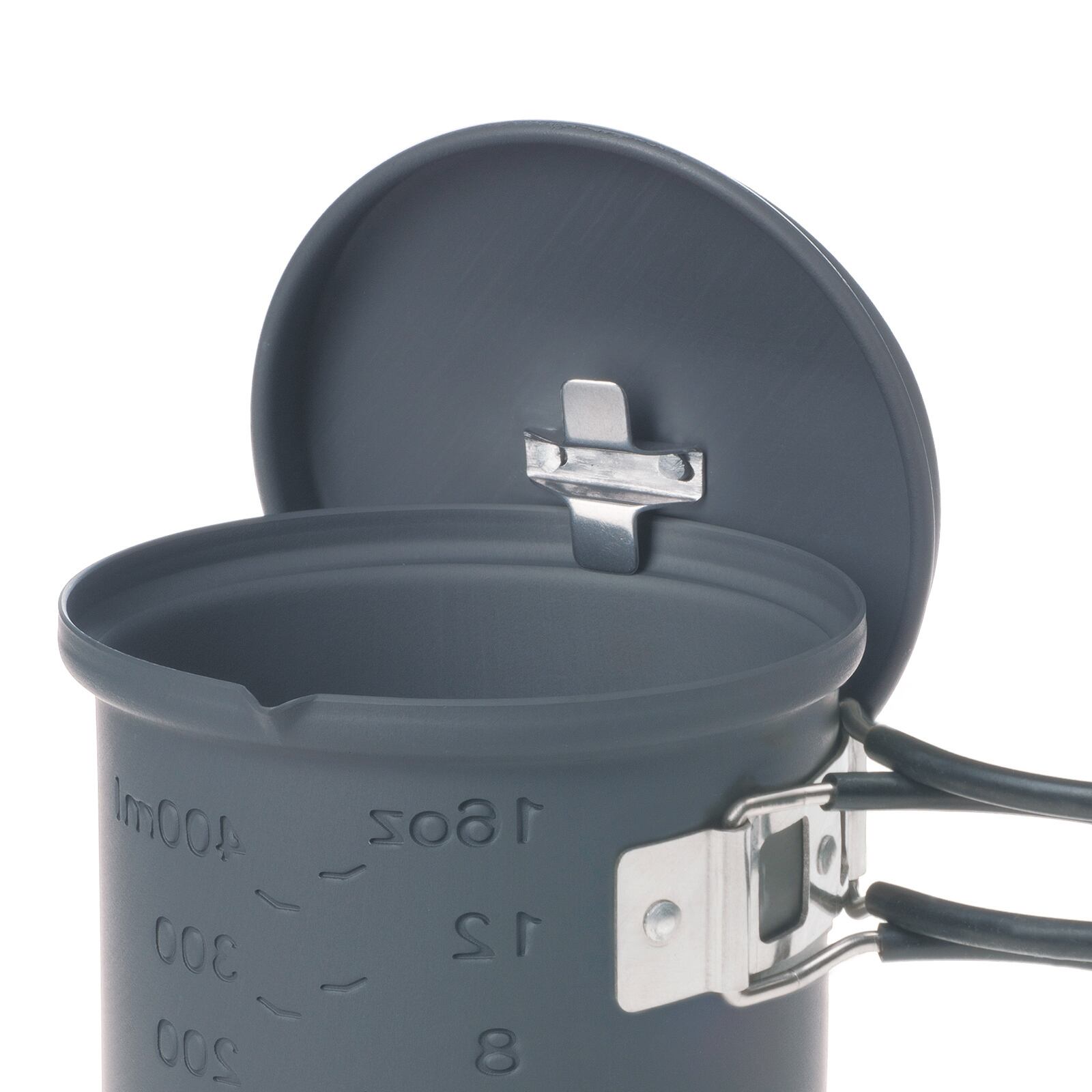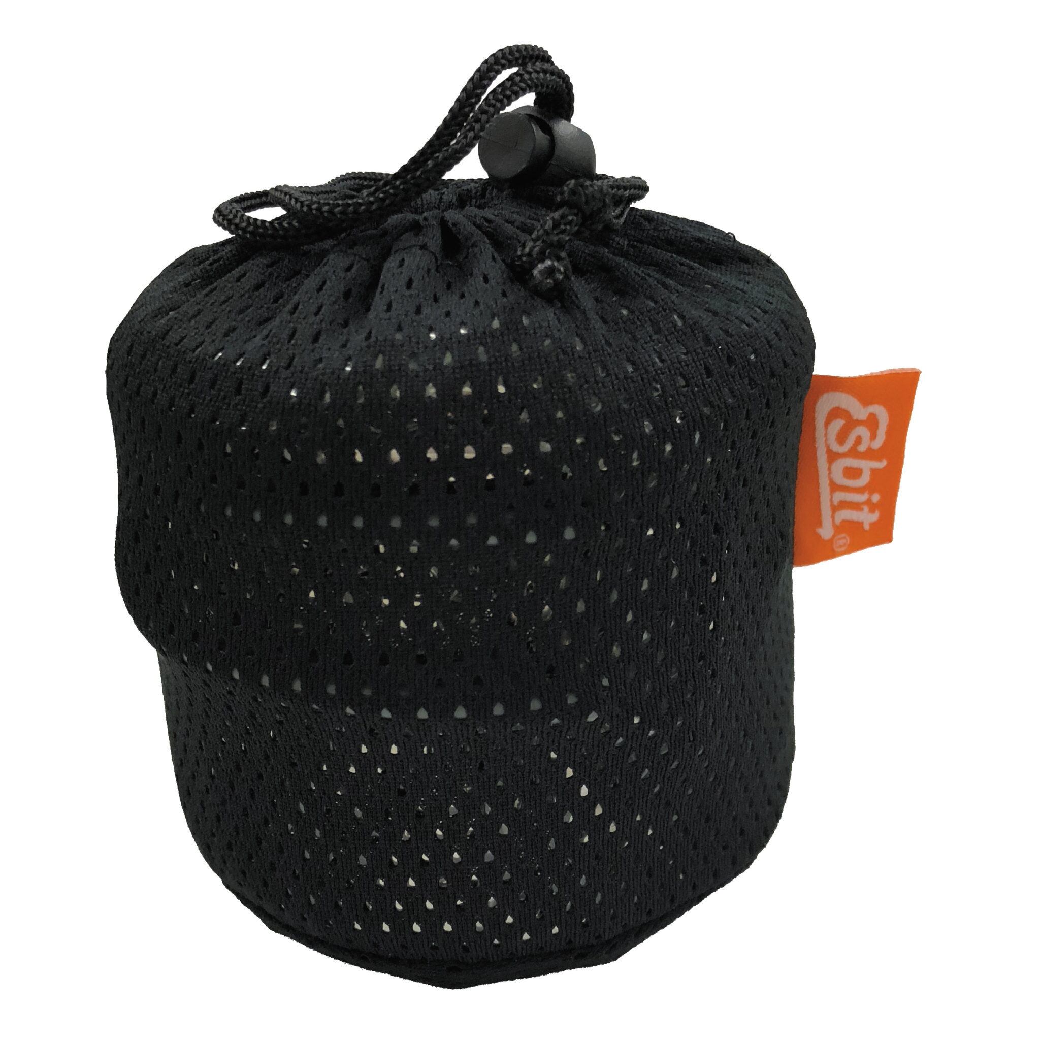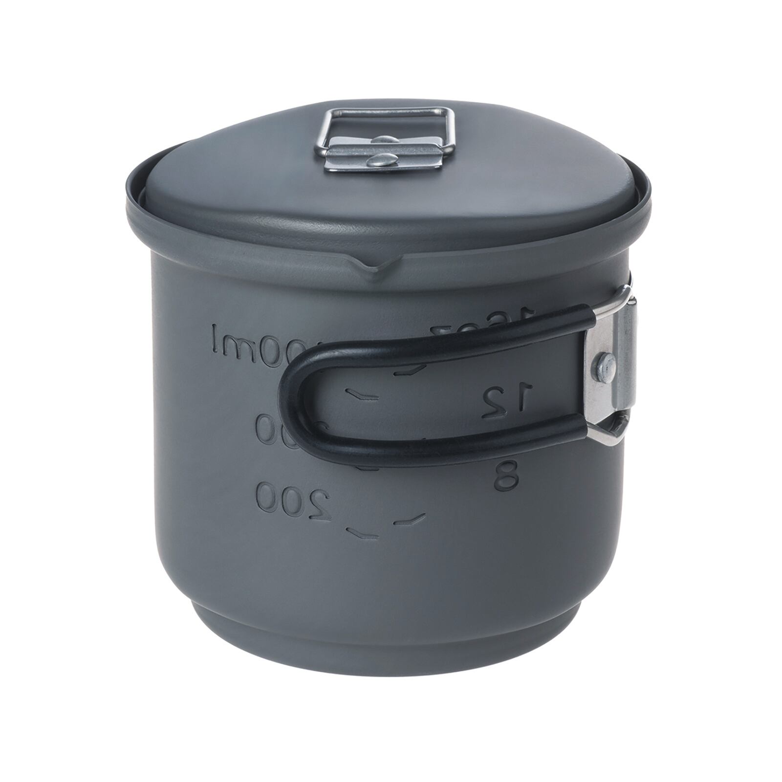 軽量、ハードアルマイト加工されたクックセットです。585mlのポット、エスビット固形燃料タブレットトレイと一体型のウインドシールドがセットになります。ポットのハンドルはステンレス製、メッシュバッグ付属、ウインドシールドはポット内に収納可能です。ミリタリーの固形燃料1タブレットで500mlの水が約7分30秒で沸騰します。