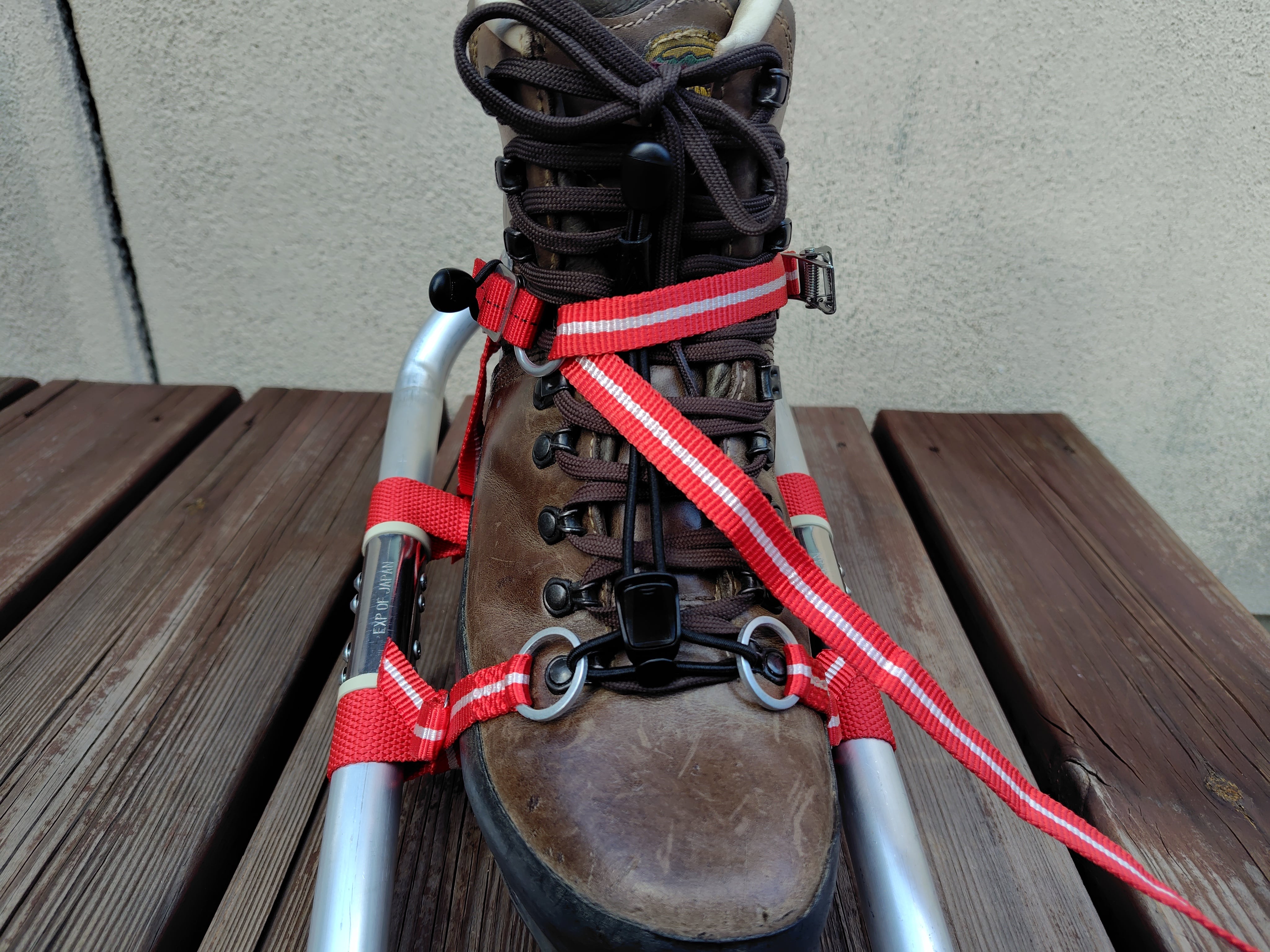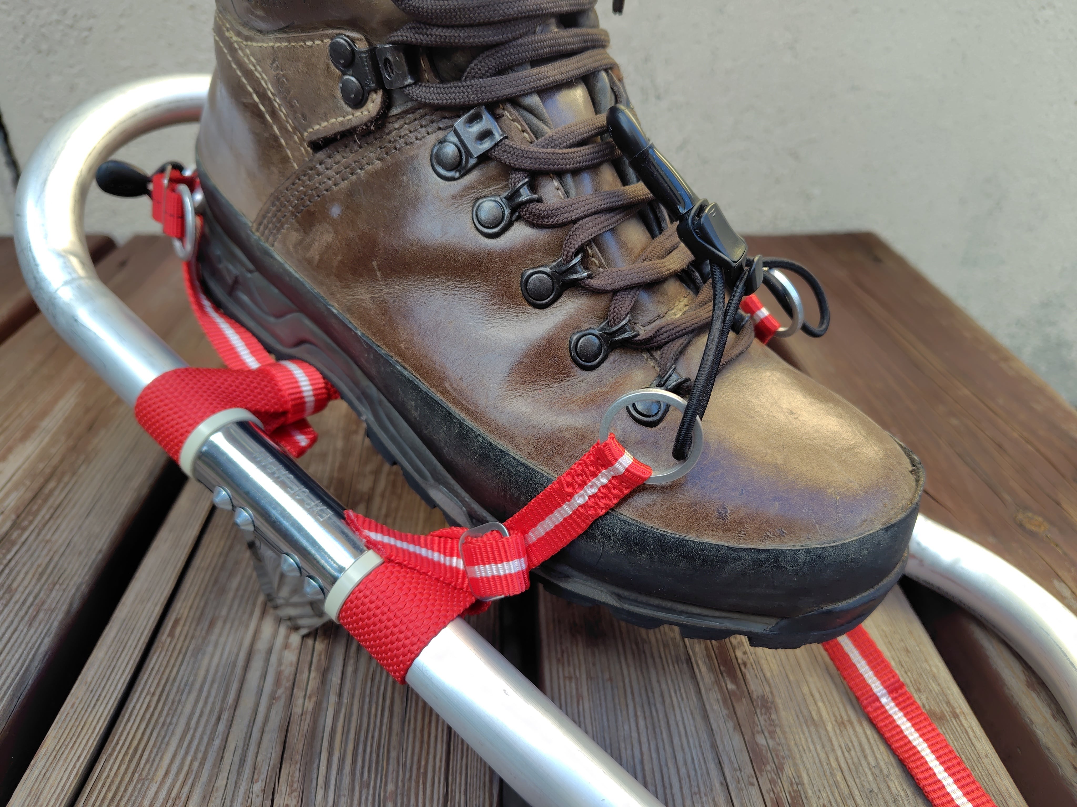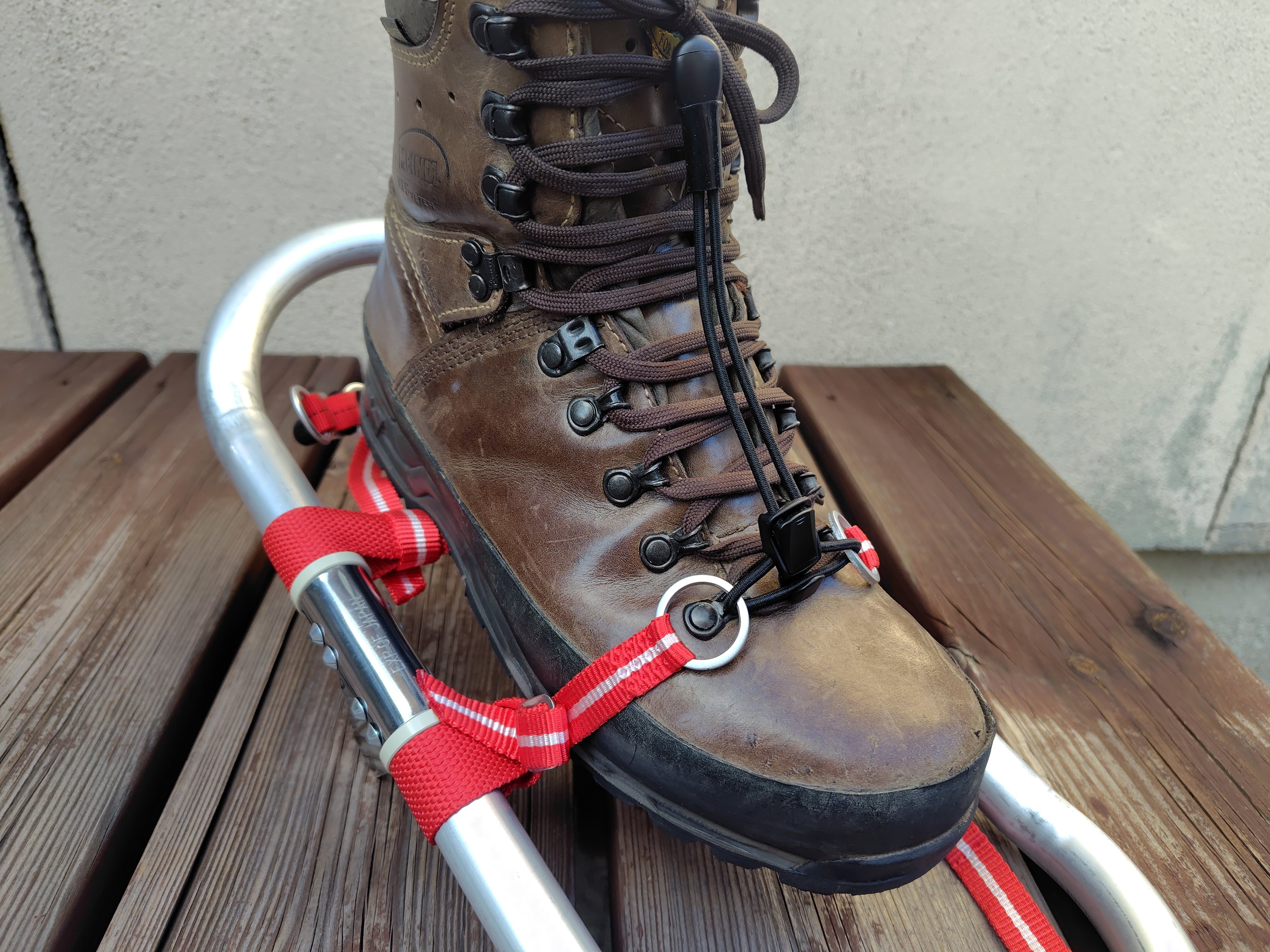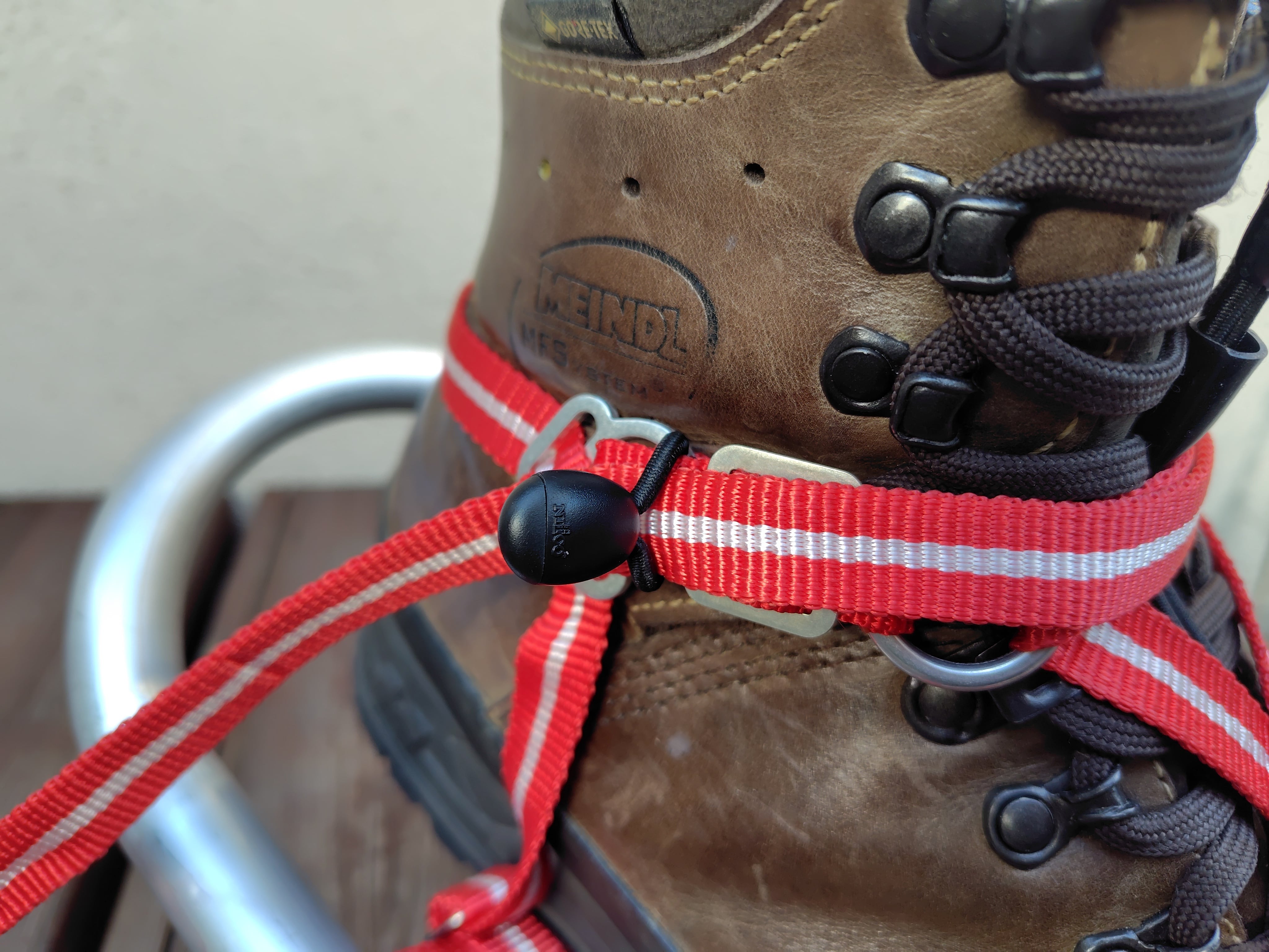 ショックコードでつま先を仮止めできるため、装着時に靴とワカンがズレにくくなります。