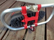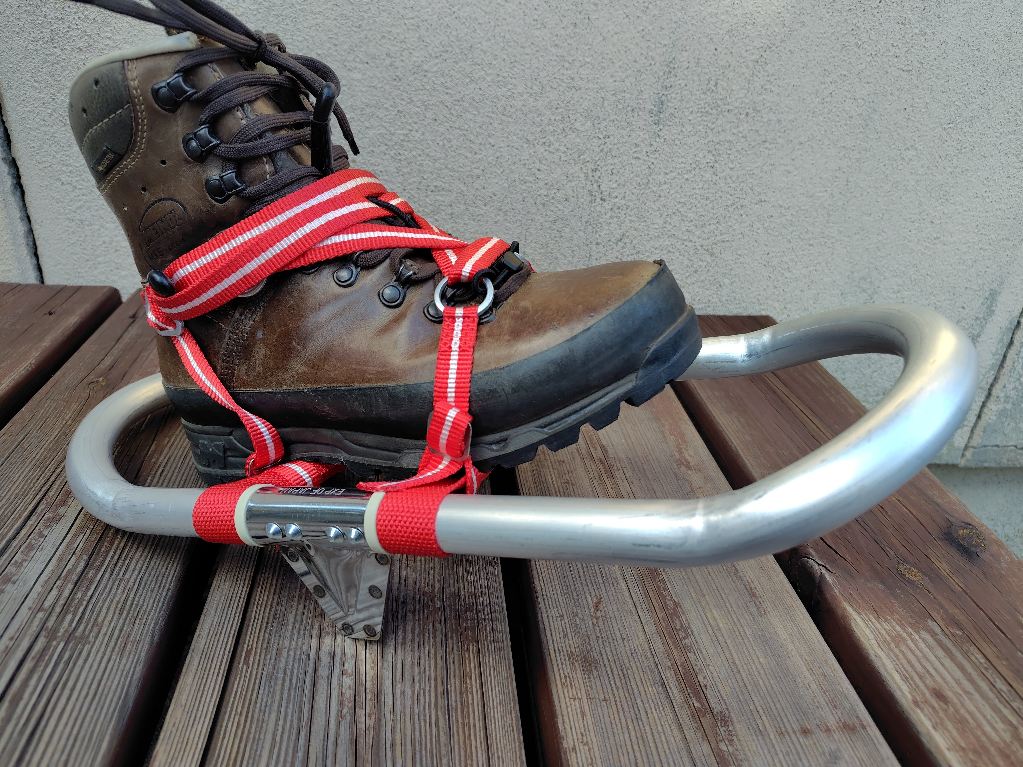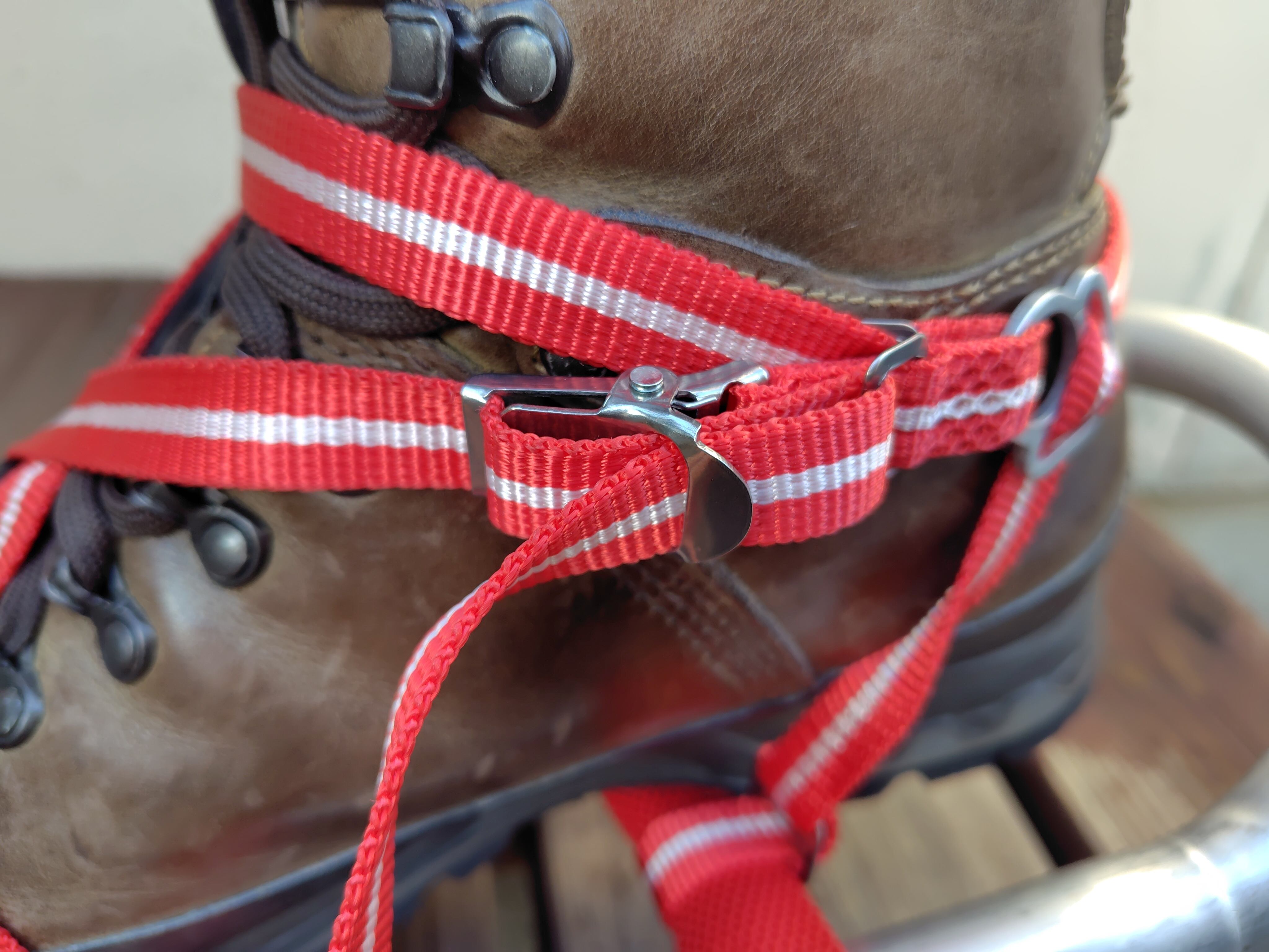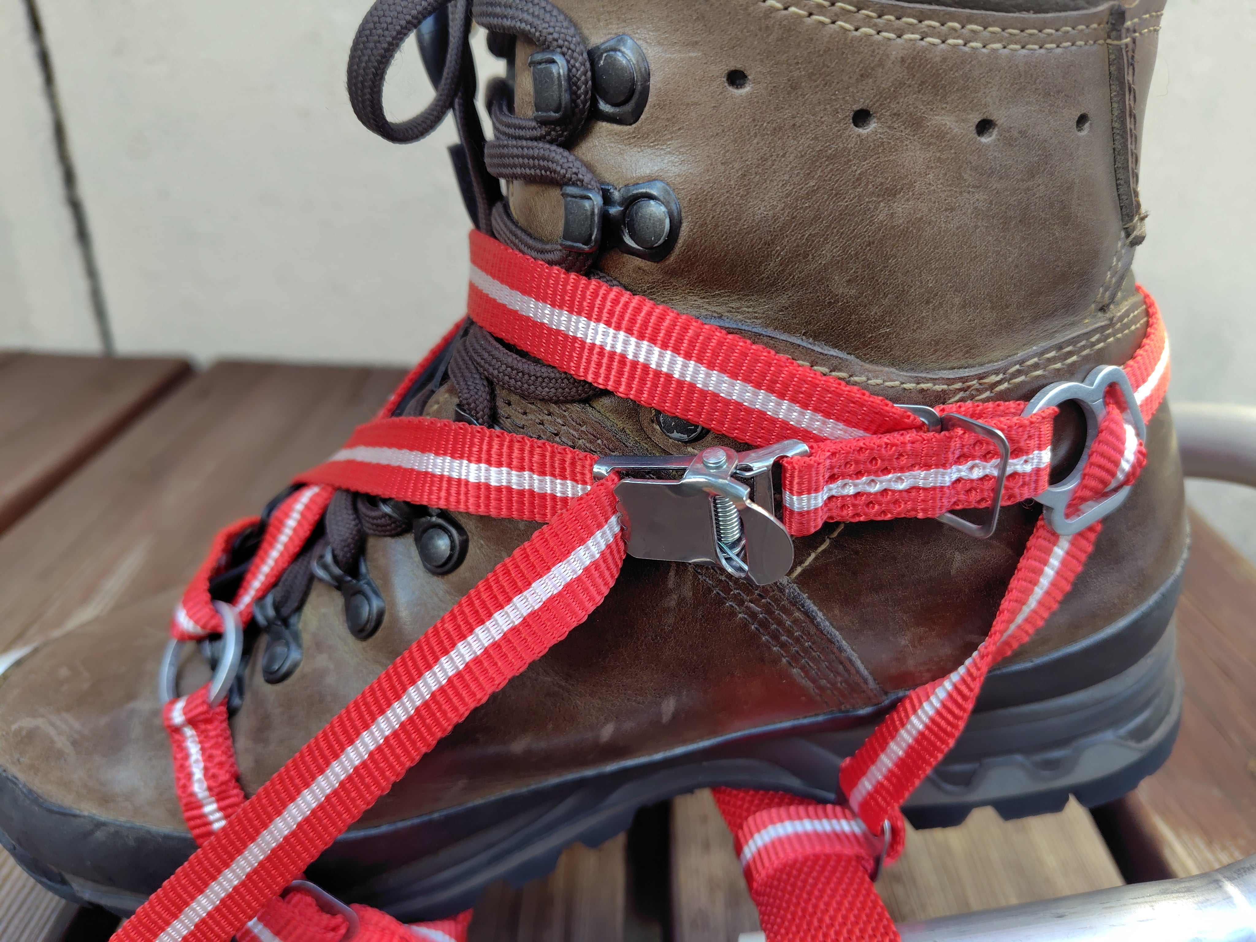ショックコードでつま先を仮止めできるため、装着時に靴とワカンがズレにくくなります。